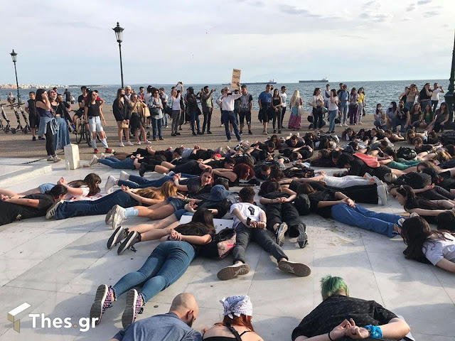 Πολύ κοντά στο Λευκό Πύργο, κοντά στο άγαλμα του Ναυάρχου Βότση ξάπλωσαν στο πλακόστρωτο της παραλίας, στη θέση του Φλόιντ που δολοφονήθηκε κατά τη διάρκεια σύλληψής του από αστυνομικούς.