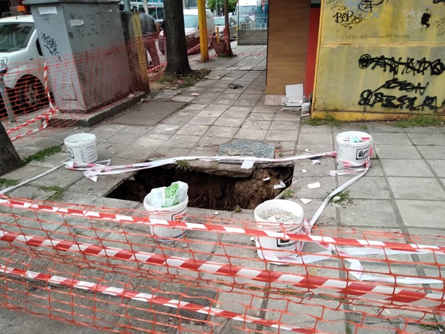 Από την υποχώρηση των πλακών δημιουργήθηκε μια μεγάλη τρύπα, βάθους περίπου 2 μέτρων, στην οποία κατέπεσε και τραυματίστηκε ο εργαζόμενος.