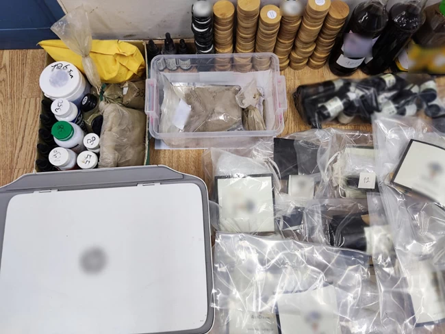 Συνολικά βρέθηκαν και κατασχέθηκαν: 78 γυάλινα φιαλίδια με περιεχόμενο διμεθυλοτρυπταμίνη ( DMT ), συνολικού βάρους -2- κιλών και -402- γραμμ.