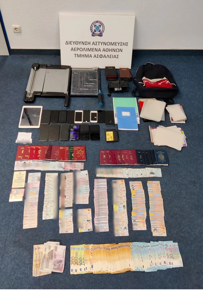 Σε έρευνες που διενεργήθηκαν στις οικίες των συλληφθέντων, σε κατάστημα καθώς και στην κατοχή τους, βρέθηκαν και κατασχέθηκαν: 244 ταξιδιωτικά έγγραφα διαφόρων χωρών, εκ των οποίων τα 22 πλαστά και τα 222 γνήσια, φορητός ηλεκτρονικός υπολογιστής, 15 κινητά τηλέφωνα, 8.790 ευρώ, 910 λίρες Αιγύπτου, 9 φωτογραφίες τύπου διαβατηρίου, 2 τετράδια σημειώσεων, τα οποία περιλαμβάνουν παραγγελίες ταξιδιωτικών εγγράφων, πλήθος δίφυλλων πλαστικοποίησης διαφόρων μεγεθών, για την παραποίηση των προσωπικών δεδομένων ταξιδιωτικών εγγράφων ή την κατασκευή εξ’ υπαρχής πλαστών ταξιδιωτικών εγγράφων, συσκευή φωτισμού UV για τον έλεγχο γνησιότητας εγγράφων, 2 συσκευές κοπής φωτογραφιών και εγγράφων, 21 θήκες διαβατηρίων. Οι συλληφθέντες, με τη σε βάρος τους σχηματισθείσα δικογραφία, οδηγήθηκαν στον κ. Εισαγγελέα Πλημμελειοδικών Αθηνών.