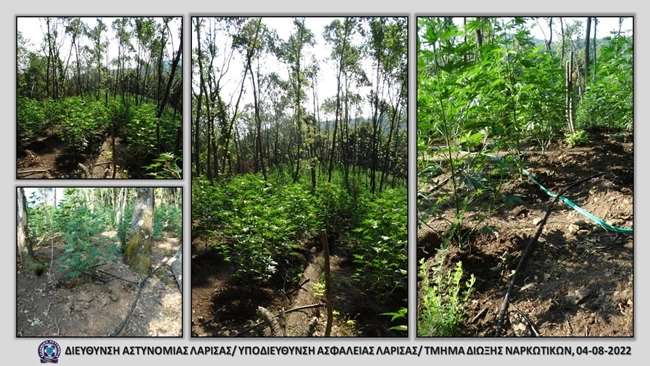 Τεράστιο πλήγμα στους λαθρέμπορους ναρκωτικών επέφεραν οι αστυνομικές αρχές της Λάρισας εντοπίζοντας τρεις φυτείες κάνναβης με 2.193 δενδρύλλια χασίς, έκταση 7 στρεμμάτων, σε δύσβατη ορεινή περιοχή της Αγιάς. Τα δέντρα έφταναν τα τρία μέτρα σε ύψος, ενώ θα απέδιδαν πάνω από 5 τόνους χασίς και έσοδα 10 εκατ. ευρώ.