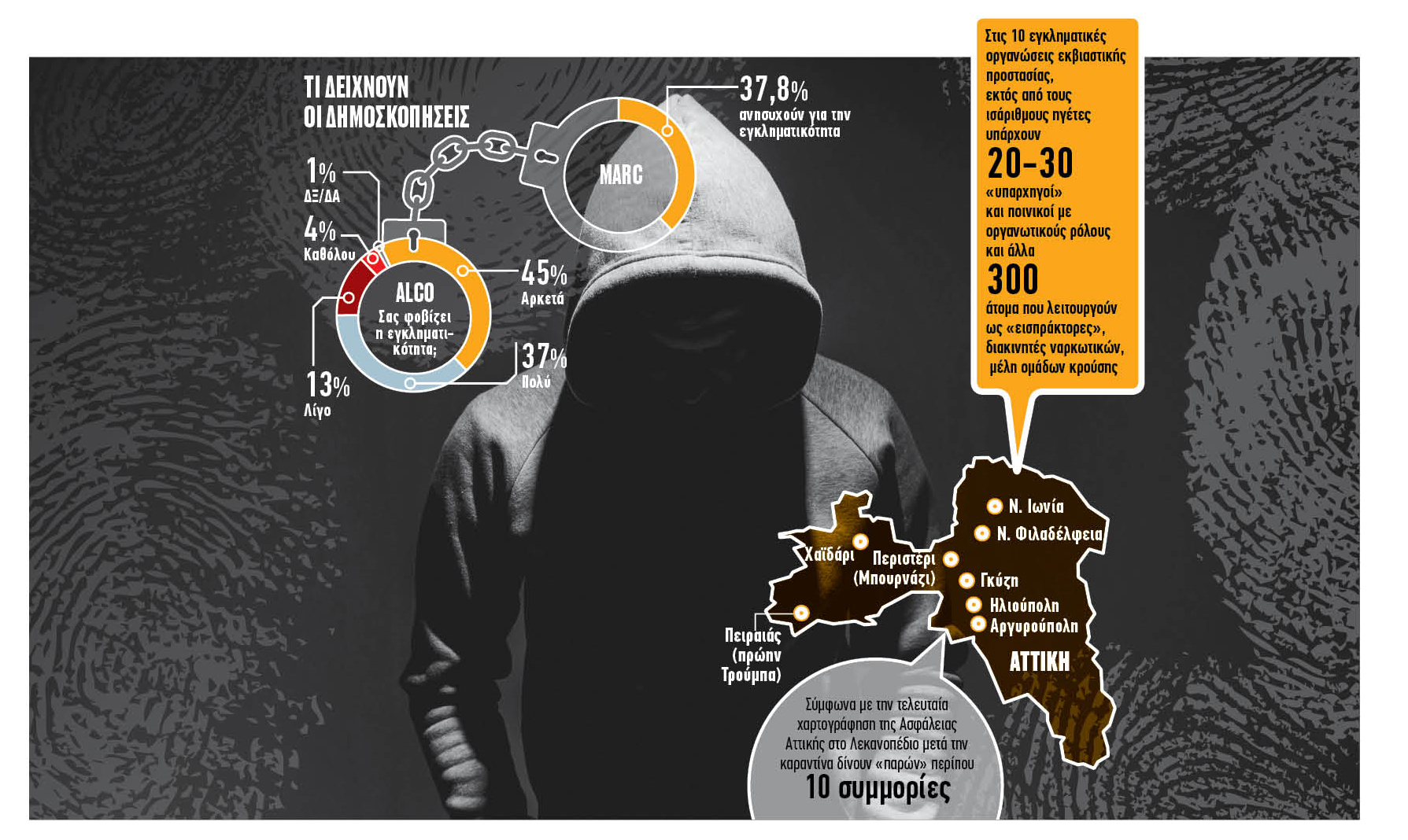Από την πλευρά του ο κ. Γ. Καλιακμάνης, πρόεδρος της Ενωσης Αστυνομικών Νοτιοανατολικής Αττικής, λέει: «Οσον αφορά το οργανωμένο έγκλημα, η γενική διαπίστωση είναι ότι δύσκολα αντιμετωπίζεται εξαιτίας του γεγονότος ότι θύτες και θύματα είναι εμπλεκόμενοι και κυριαρχεί ο άγραφος νόμος της σιωπής. Αυτό το φαινόμενο έχει να κάνει με την προσέλευση στη χώρα μας εισαγόμενων σκληρών ποινικών, αλλά και της προσπάθειας ανόδου στην εγκληματική ιεραρχία νέων προσώπων που διεκδικούν το δικό τους κομμάτι από την οικονομική πίτα».
