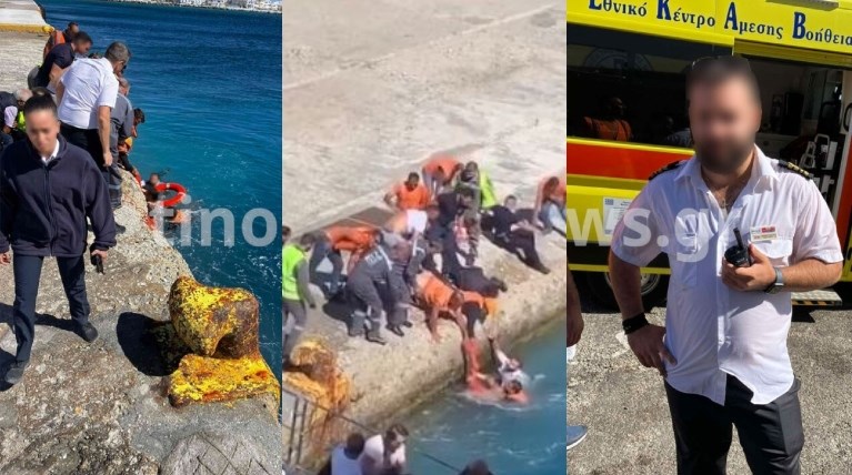 Σύμφωνα με το tinosnews.gr, αμέσως βούτηξαν στη θάλασσα ο ύπαρχος του πλοίου, ένας λιμενικός, ένας καβοδέτης, για να βγάλουν τη γυναίκα, ενώ έσπευσαν για βοήθεια και άλλοι, πετώντας τους σωσίβια.