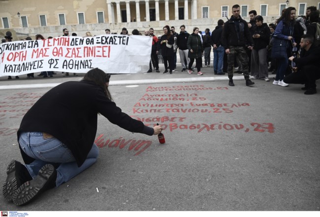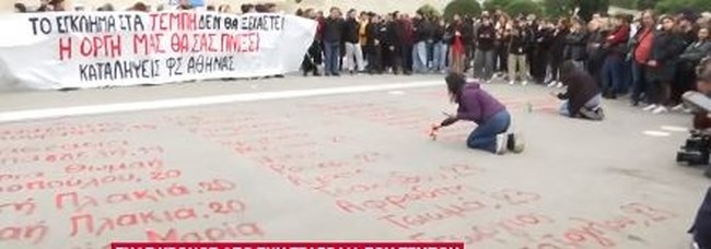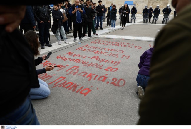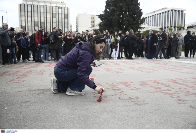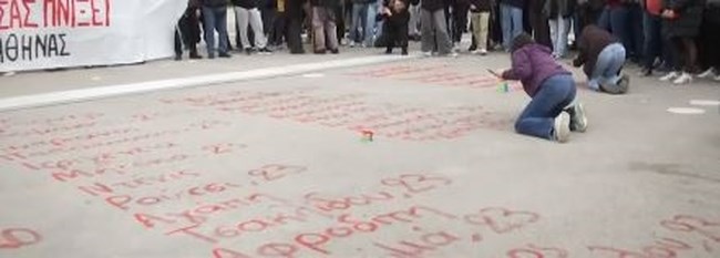 Οι στιγμές που εκτυλίχθηκαν στο Σύνταγμα κατά τη διάρκεια της πορείας ήταν συγκλονιστικές, με κορυφαία αυτοί που συγκεντρωμένοι έγραψαν με κόκκινη μπογιά τα 57 ονόματα των θυμάτων των Τεμπών μπροστά από το μνημείο του Αγνώστου Στρατιώτη.
