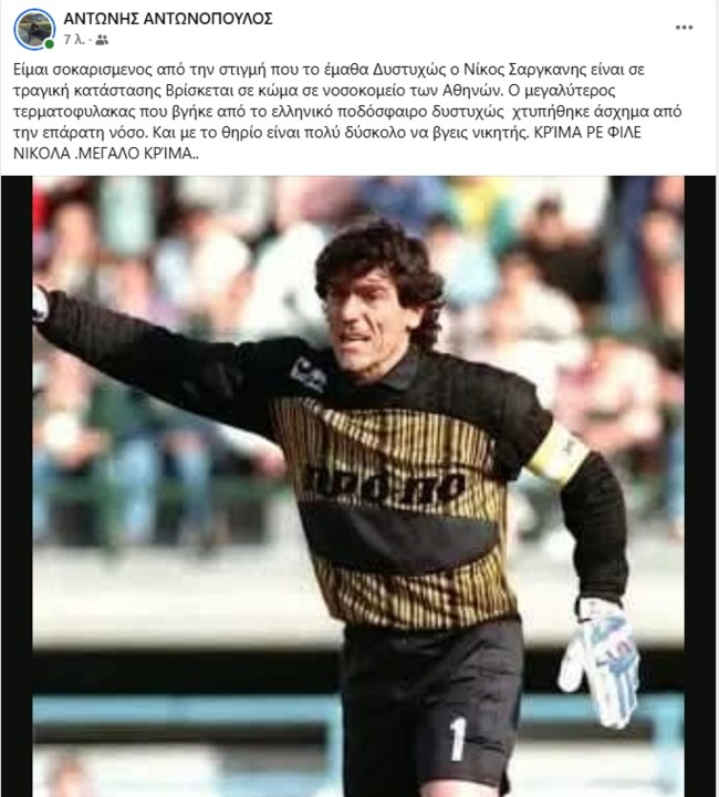 "Είμαι σοκαρισμένος από την στιγμή που το έμαθα. Δυστυχώς ο Νίκος Σαργκάνης είναι σε τραγική κατάσταση. Βρίσκεται σε κώμα σε νοσοκομείο των Αθηνών. Ο μεγαλύτερος τερματοφύλακας που βγήκε από το ελληνικό ποδόσφαιρο δυστυχώς χτυπήθηκε άσχημα από την επάρατη νόσο. Και με το θηρίο είναι πολύ δύσκολο να βγεις νικητής. Κρίμα ρε φίλε Νικόλα. Μεγάλο κρίμα", έγραψε ο έμπειρος αθλητικός δημοσιογράφος.