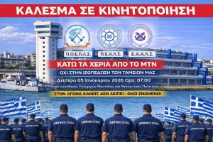 Την ίδια μέρα και ώρα οι Πρωτοβάθμιες Ενώσεις Προσωπικού θα πραγματοποιήσουν αντίστοιχες διαμαρτυρίες στις Λιμενικές Αρχές ενώ παράλληλα απευθύνουμε κάλεσμα προς το σύνολο των εν ενεργεία και εν αποστρατεία στελεχών ανεξαρτήτως βαθμού να συμμετάσχουν συντονισμένα στις κινητοποιήσεις!